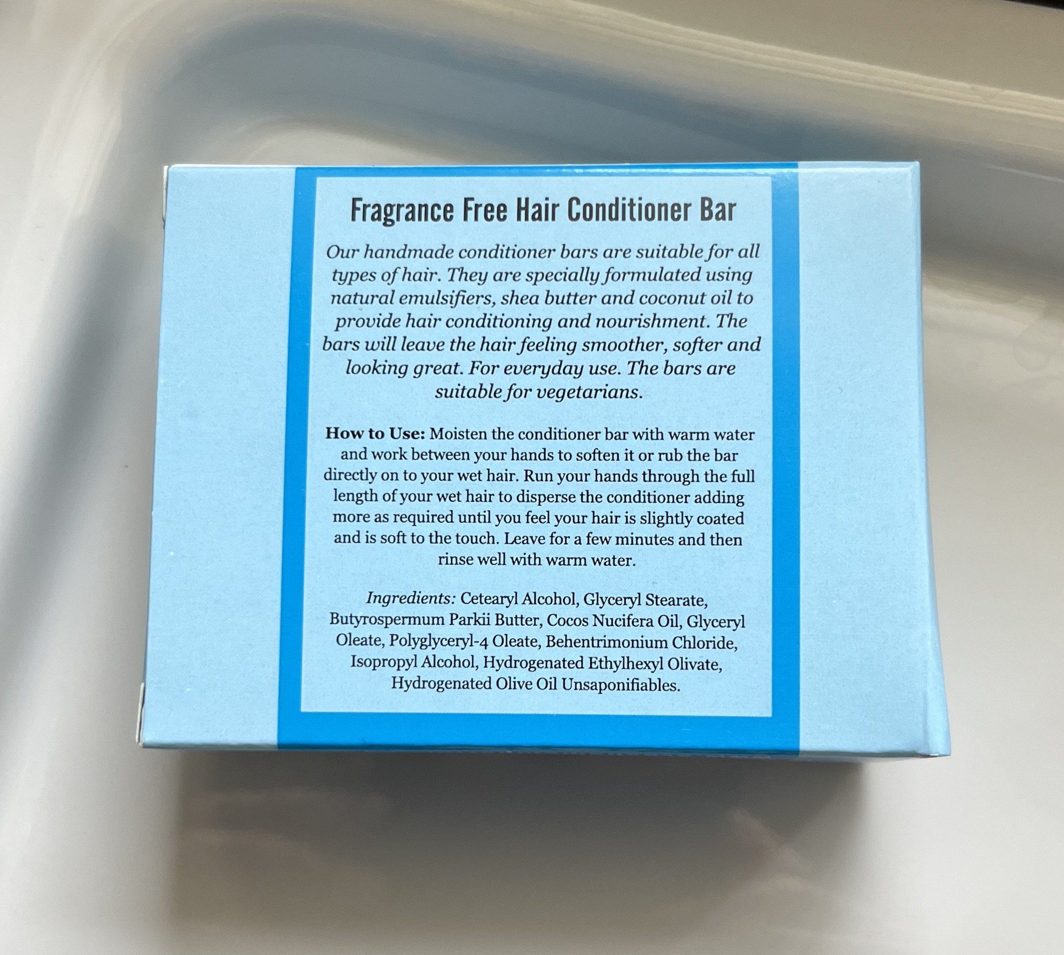 How to Use: Moisten the conditioner bar with warm water and work between your hands to soften it or rub the bar directly on to your wet hair. Run your hands through the full length of your wet hair to disperse the conditioner adding more as required until you feel your hair is slightly coated and is soft to the touch. Leave for a few minutes and then rinse well with warm water.